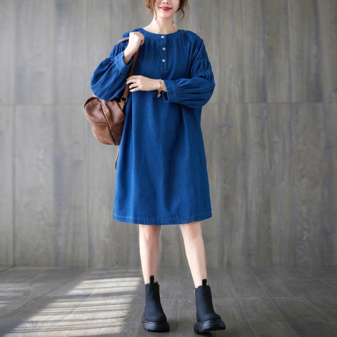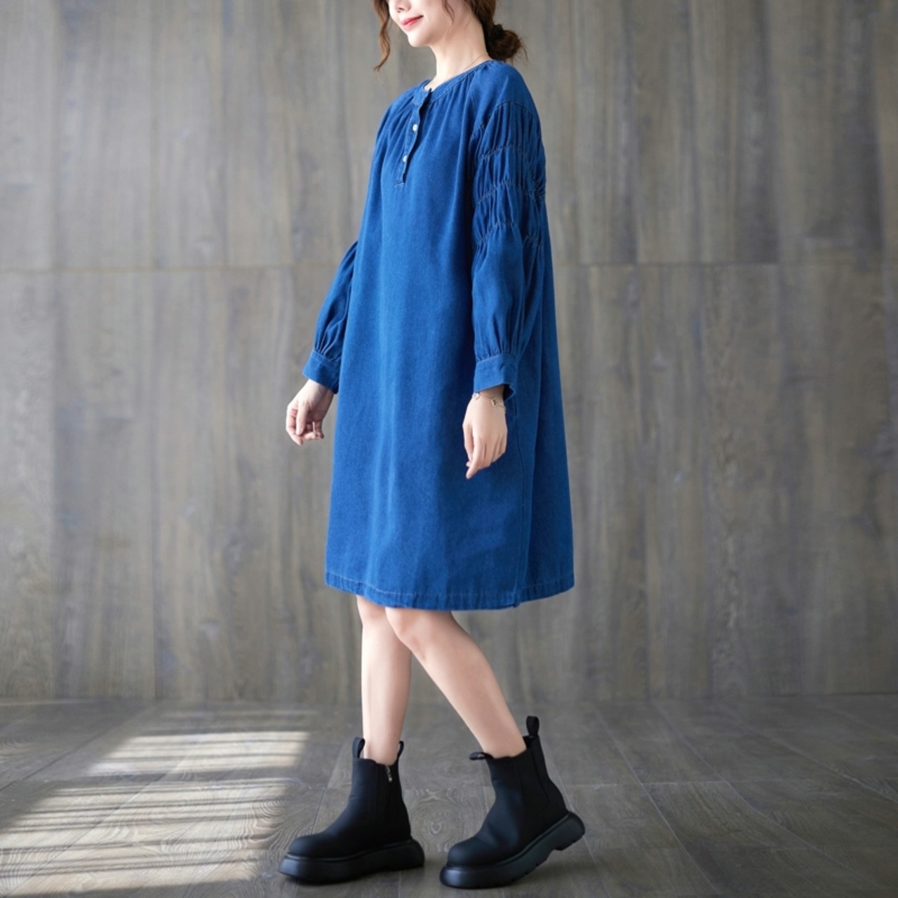 ウエスト ゆったり 長袖 ファッション デニム ミディアム スカート ドレス ワンピース ダークブルー 大きい サイズ レディース 大人 女子 オフィス アウター お気に入り アイテム 通販 WOMEN 477