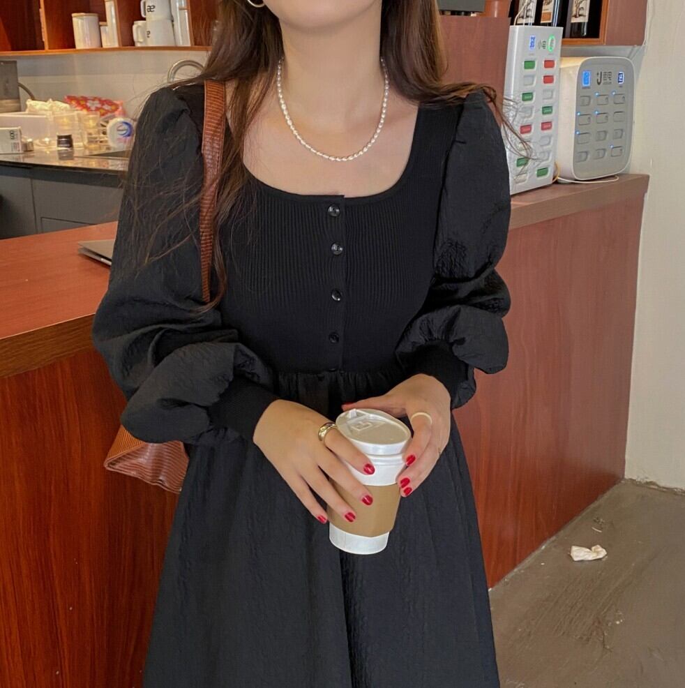 シックなブラック スクエアネック バストニット パフスリーブ カジュアル ロング ドレス ワンピース 大きい サイズ レディース 大人 女子 オフィス アウター お気に入り アイテム 通販 WOMEN 494