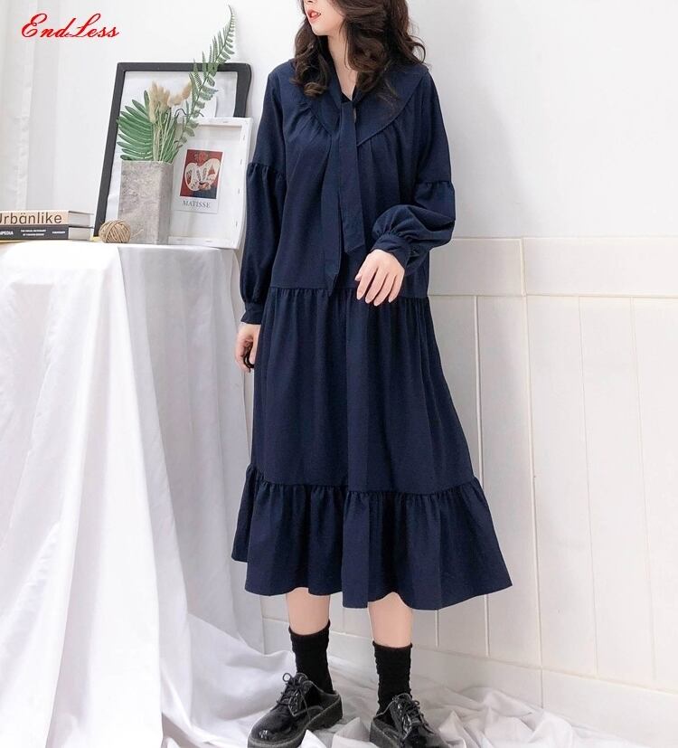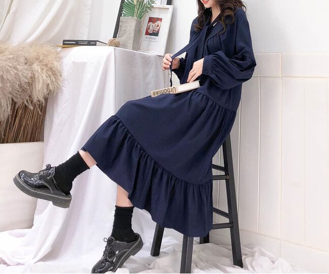 ゆったり ルーズ ひざ丈 スカート 長袖 カジュアル ドレス ワンピース ネイビー ブルー 大きい サイズ レディース 大人 女子 オフィス アウター お気に入り アイテム 通販 WOMEN 495