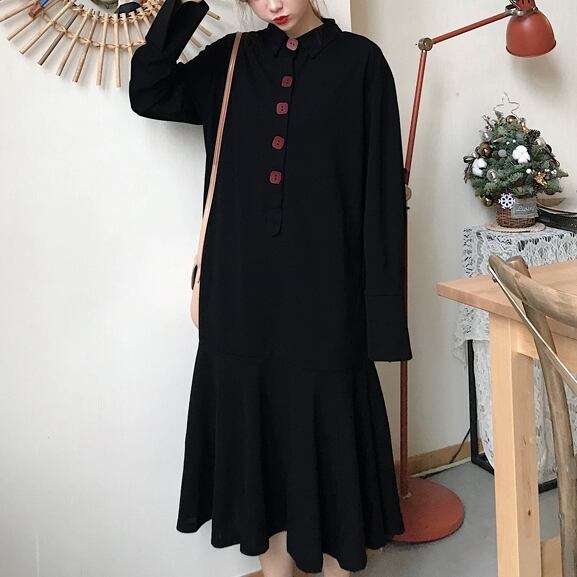 L 〜 4XL ゆったり ビッグサイズ 長袖 レトロ ボタン ロング スカート ドレス カジュアル ワンピース ブラック 大きい サイズ レディース 大人 女子 オフィス アウター お気に入り アイテム ぽっちゃり 通販 WOMEN 3XL 2XL 544
