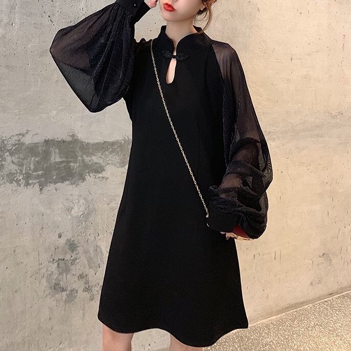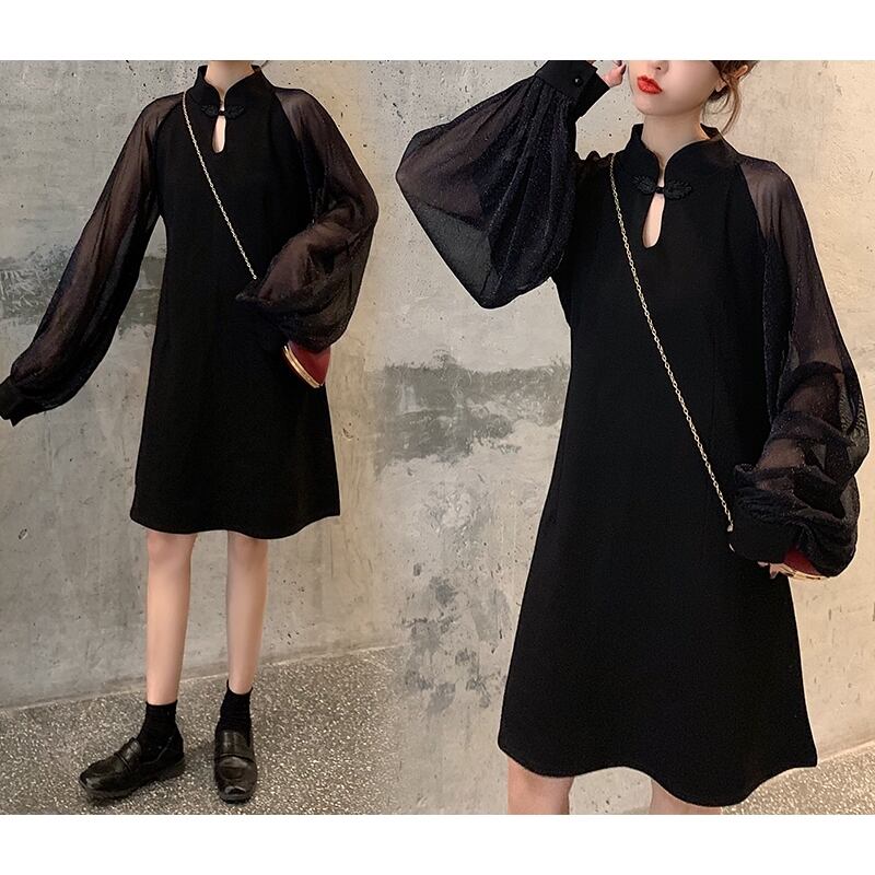 L 〜 4XL ゆったり メッシュ ランタンスリーブ 長袖 カジュアル ドレス ブラック 大きい サイズ レディース 大人 女子 オフィス アウター お気に入り アイテム ぽっちゃり 通販 WOMEN 3XL 2XL 546