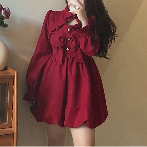 ● かわいいバブルスリーブ 胸元が可愛い 大きめミニドレス ワンピースです。