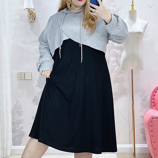 フード付き パーカーベスト ワンピース 2ピースセット ドレス 黒 大きいサイズ レディース トップス カジュアル 海外 通販 5l 3l 2l 4l 700