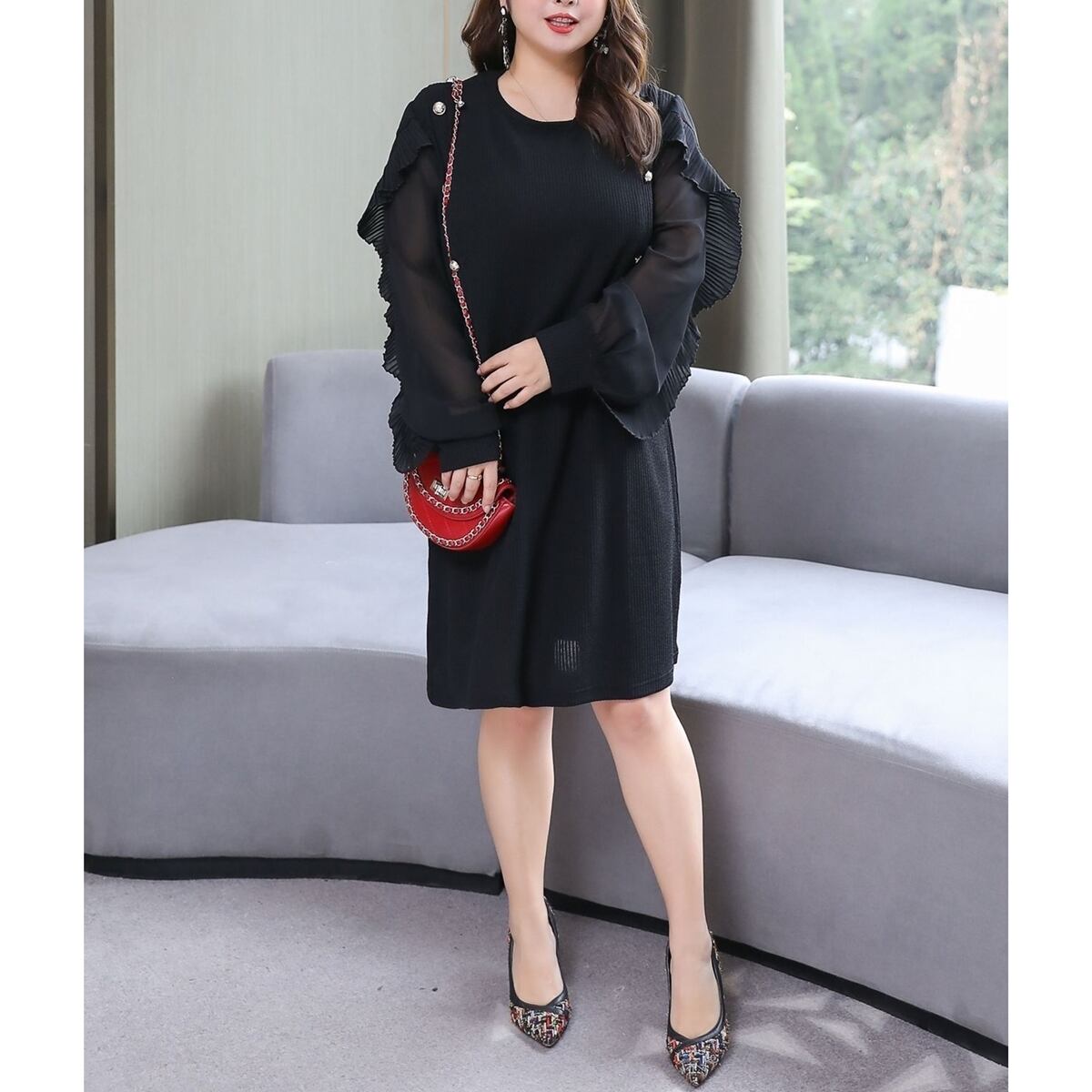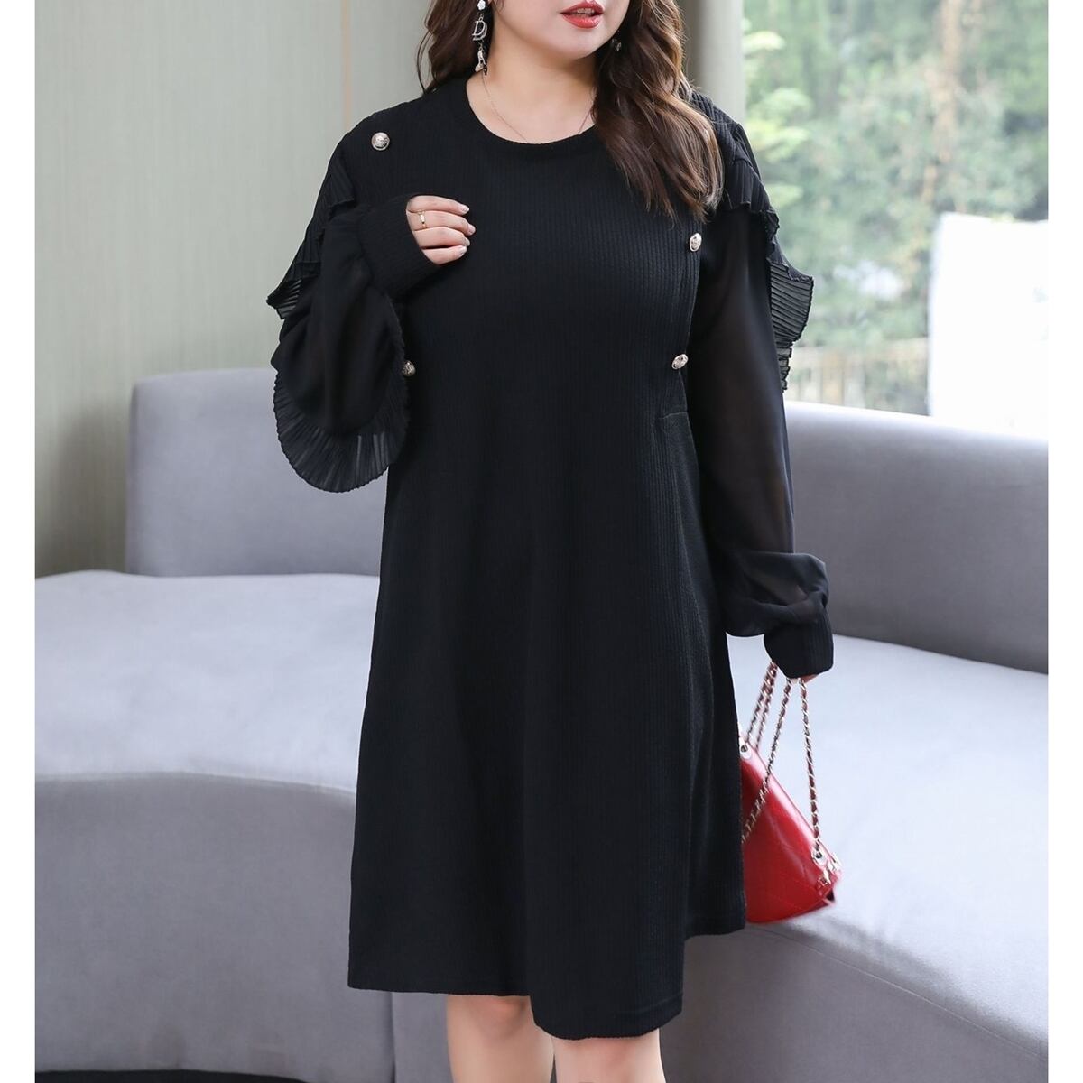 特大サイズ フリル レーズ 長袖 スキニー ブラック ドレス 黒 大きいサイズ レディース エレガント フォーマル 海外 通販 8l 7l 6l 5l 708