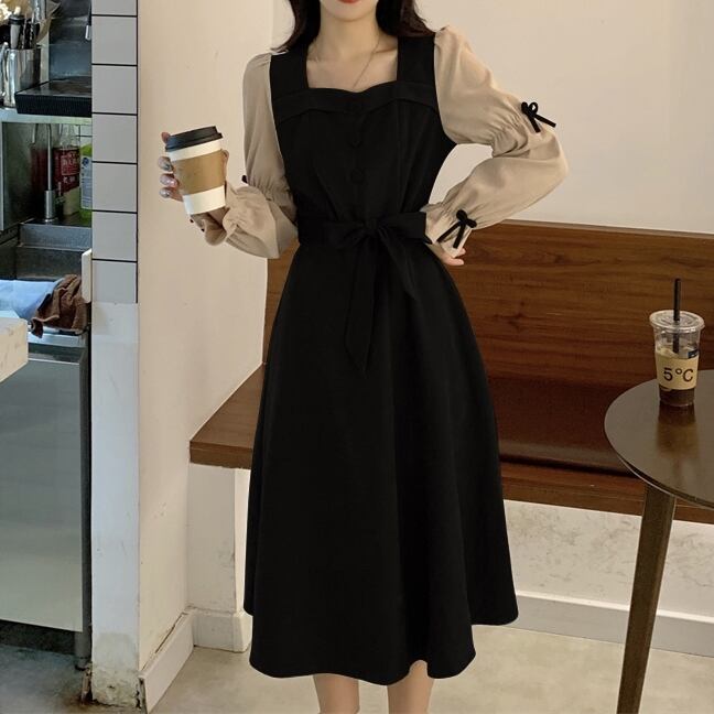スクエアカラー 長袖 ウエスト ゆったり ベルト ワンピース ドレス 黒 大きいサイズ レディース エレガント カジュアル フォーマル ぽっちゃり 春 秋 海外 通販 3l 5l 4l 749