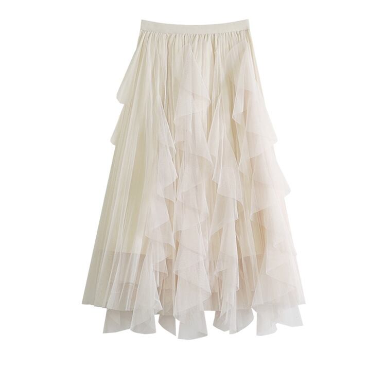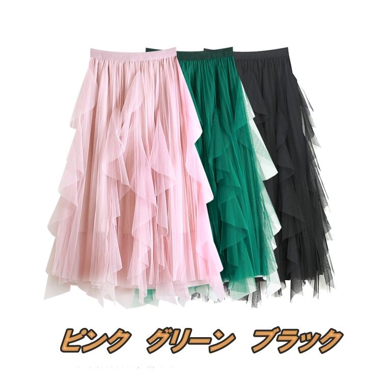 カジュアル メッシュ ボリューム ミディアム スカート 黒 春 秋 カジュアル レディース 大人 女子 安い 通販 783