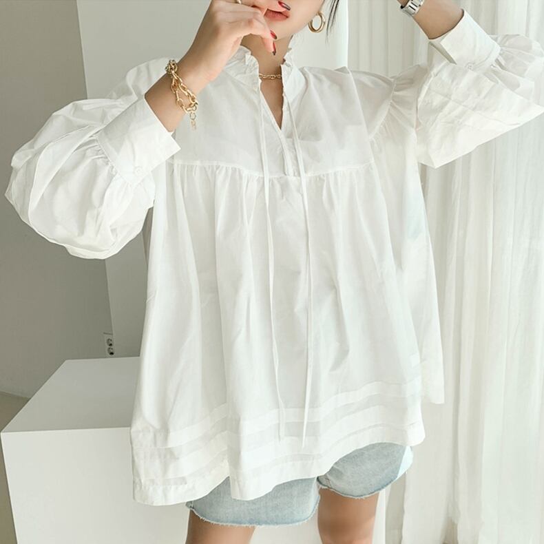 ゆったり バブルスリーブ ストライプ ブラウス シャツ カジュアル 春 夏 レディース トップス 海外 通販 786
