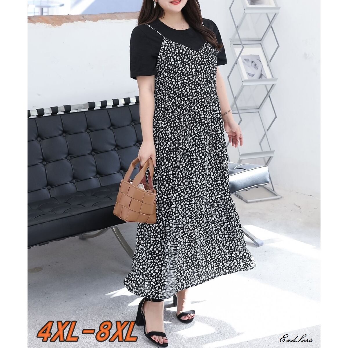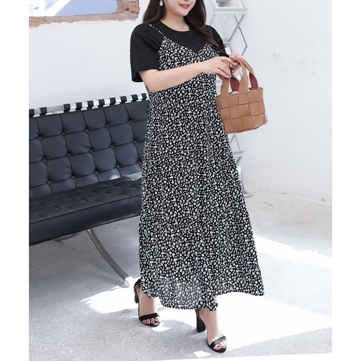 6XL - 3XL 大きいサイズ レディース 花柄 スリング ワンピース 半袖 ブラック tシャツ 2ピースセット ミディアム丈 スカート ワンピース ドレス 黒 春 きれいめ ワンピースドレス 可愛い きれいめ コーデ 重ね着 ゆったり おしゃれ ゆったりめ フェミニン リゾート カジュアルコーデ 大きいサイズの店 安い 女子 通販 6l 5l 4l 869