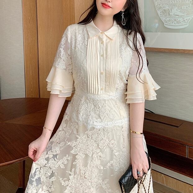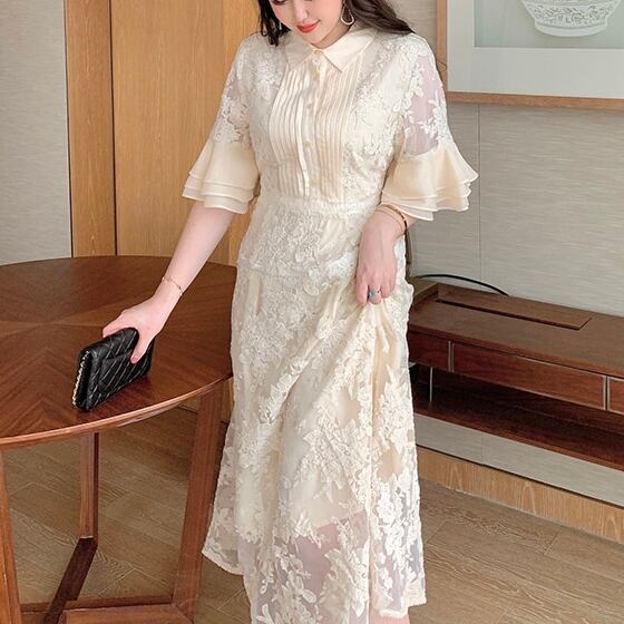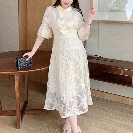 5XL - L ホーンスリーブ ゆったり レース ステッチ サマー カジュアル ドレス ワンピース グラマー 夏 大きいサイズ レディース 大きいサイズの店 通販 安い 5l 4l 3l 957