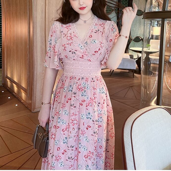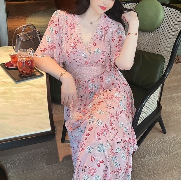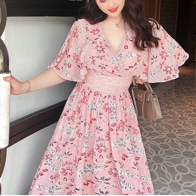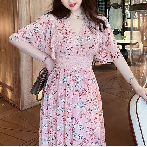 5XL - L 花柄 半袖 ホーンスリーブ スキニー ウエスト カジュアル ドレス ゆったり グラマー 春 夏 大きいサイズ レディース 大きいサイズの店 通販 安い 5l 4l 3l 2l 968