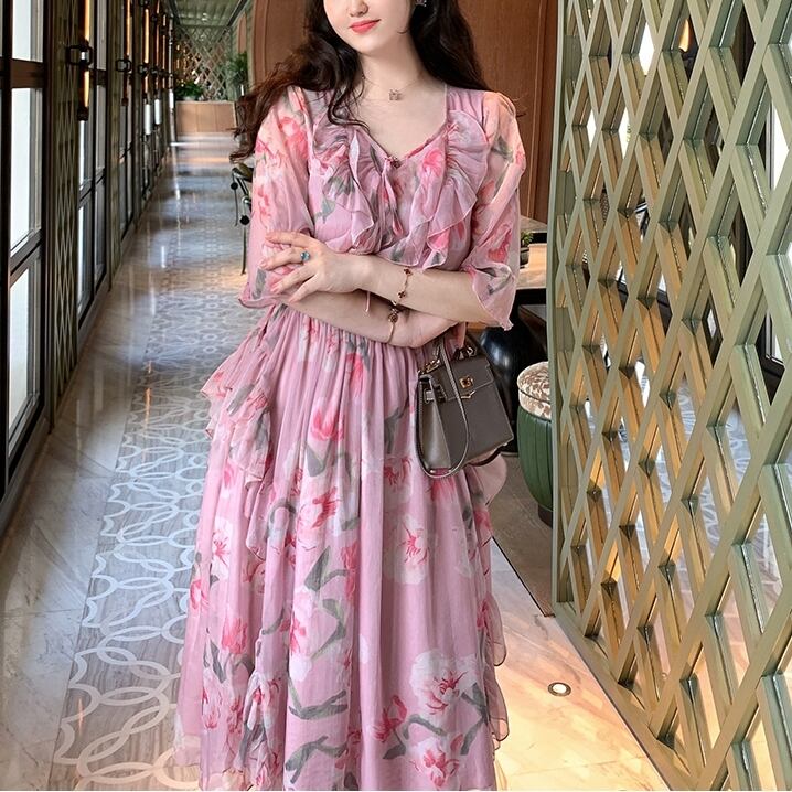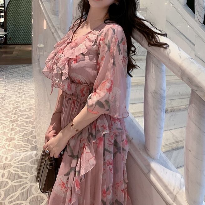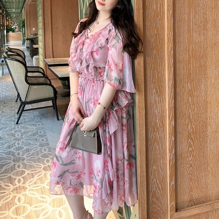 5XL - L 花柄 シフォン Vネック カジュアル サマー ドレス ゆったり グラマー 春 夏 大きいサイズ レディース 大きいサイズの店 通販 安い 5l 4l 3l 2l 981