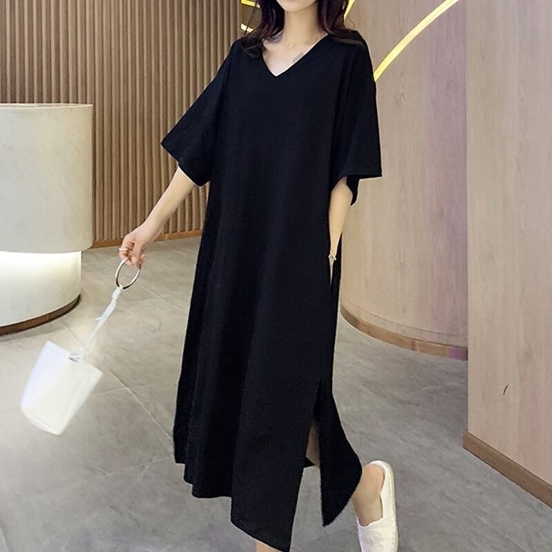 3XL - L ウエストカバー 半袖 サマー カジュアル コットン ロング ワンピース ドレス 黒 ゆったり グラマー 春 夏 大きいサイズ レディース 大きいサイズの店 通販 安い 3l 2l 1009