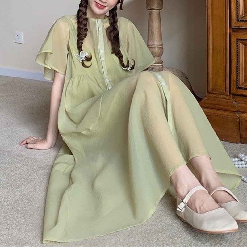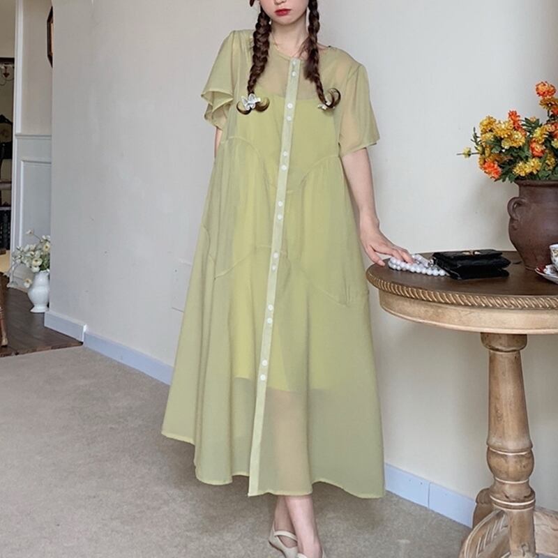 4XL -M バッドスリーブ 半袖 インナースカート 2枚セット カジュアル ドレス ワンピース ゆったり グラマー 春 夏 大きいサイズ レディース 大きいサイズの店 通販 安い 4l 3l 2l 1011