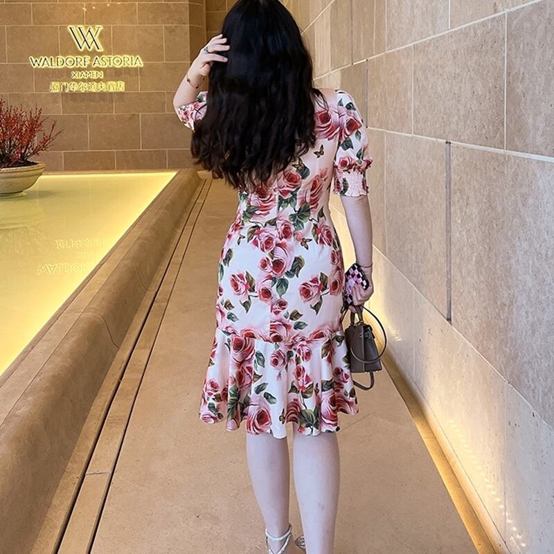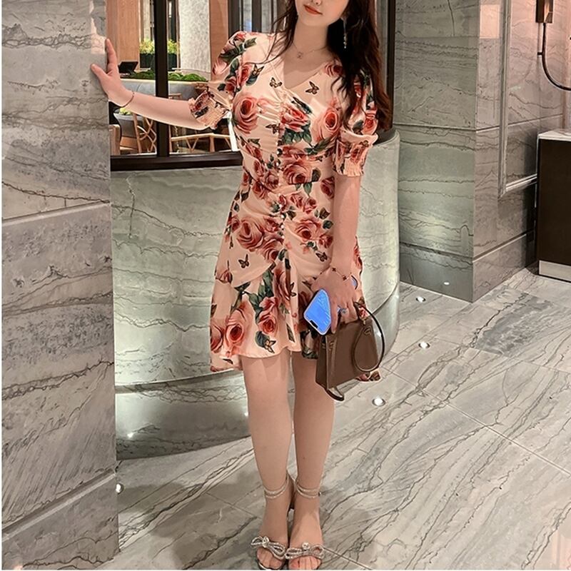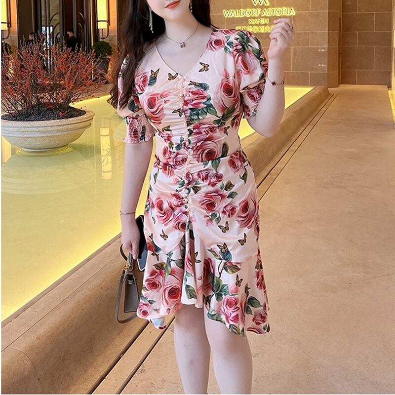 5XL - L レトロ 花柄 バブルスリーブ vネック カジュアル ドレス ゆったり グラマー 春 夏 大きいサイズ レディース 大きいサイズの店 通販 安い 5l 4l 3l 2l 1022