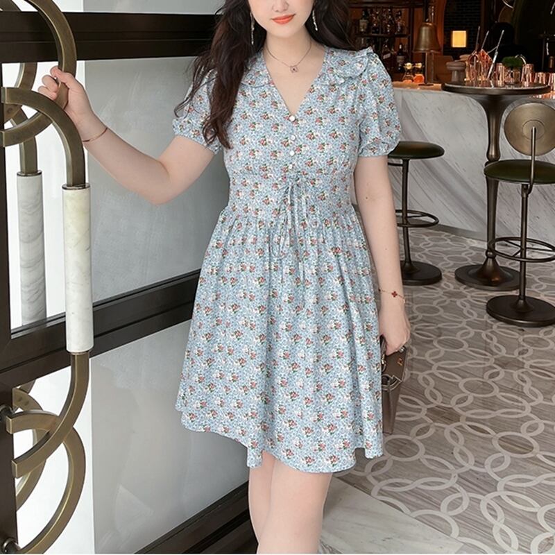 5XL - L 大きいサイズ 花柄 ドレス 半袖 ヴィンテージ ブルー ドレス 大きいサイズ ワンピース ゆったり グラマー 春 夏 大きいサイズレディース 大きいサイズの店 大きいサイズ 服 通販 安い 5l 4l 3l 2l 1027