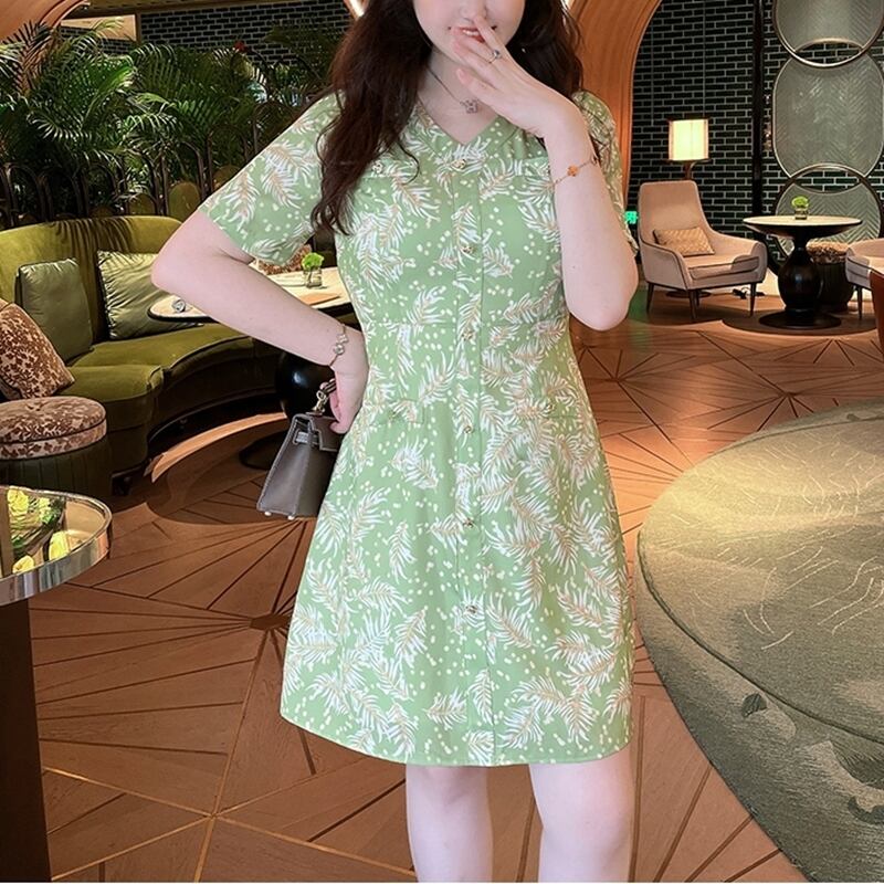 5XL - L 大きいサイズ 花柄 ドレス グリーン ワンピース vネック シフォンワンピース 大きいサイズレディース 大きいサイズの店 大きいサイズ 服 通販 海外 安い 5l 4l 3l 2l 1030