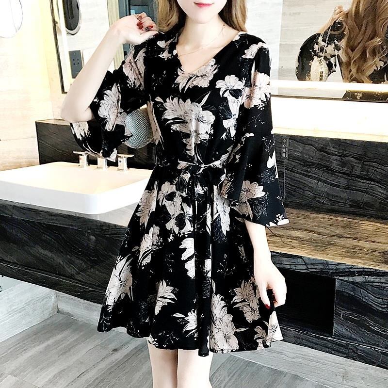 4XL - L 花柄 シフォン バッドスリーブ 長袖 ゆったり シャツ ドレス 黒 大きいサイズ ドレス 海外 大きいサイズ 結婚式 大きいサイズ 安い 大きいサイズ 4l 3l 2l M1037