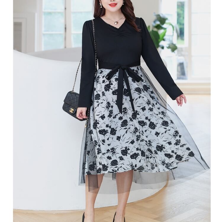 【 送料無料 】 プラスサイズ 長袖 花柄 メッシュ Vネック カジュアル ドレス 春 秋 黒 ウエディング 大きいサイズ レディース 大きいサイズの店 ワンピース 安い 海外 店舗 お店 かわいい 演奏会 10l 9l 8l 7l 6l 5l 4l 3l M1521