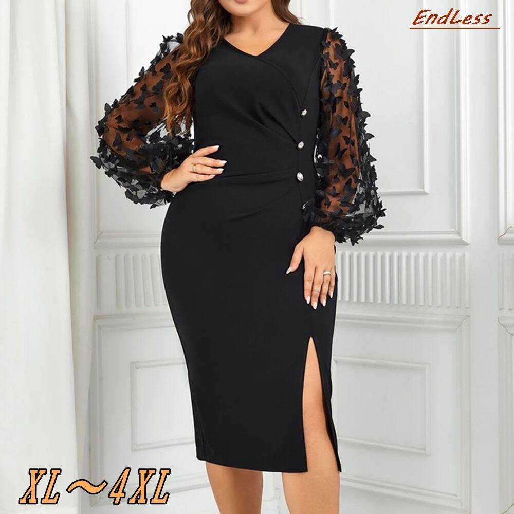 【XL~4XL】 ビッグサイズ 長袖 バルブスリーブ ドレス
