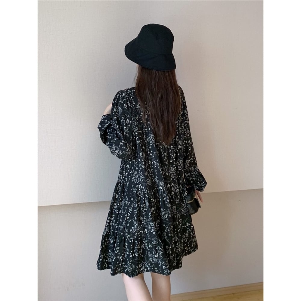 【L~4XL】プラスサイズ ゆったり 長袖 花柄 ドレス