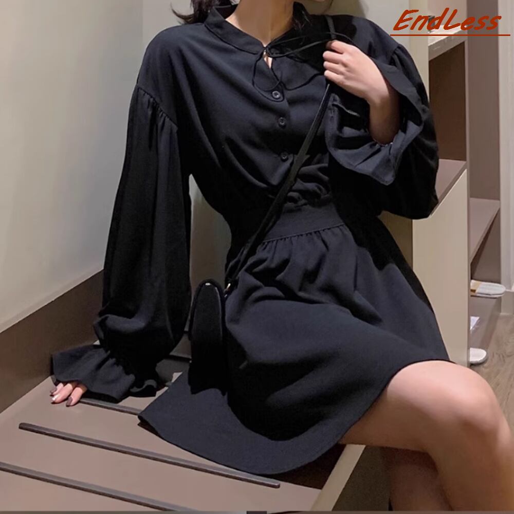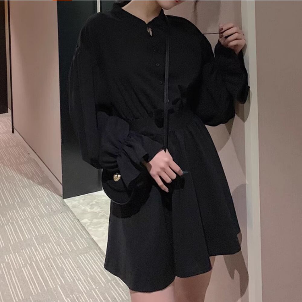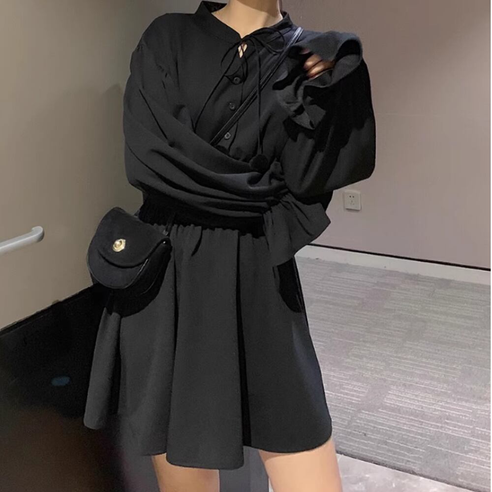 【S~XL】 ロングスリーブ ブラック シャツ ミニ ドレス