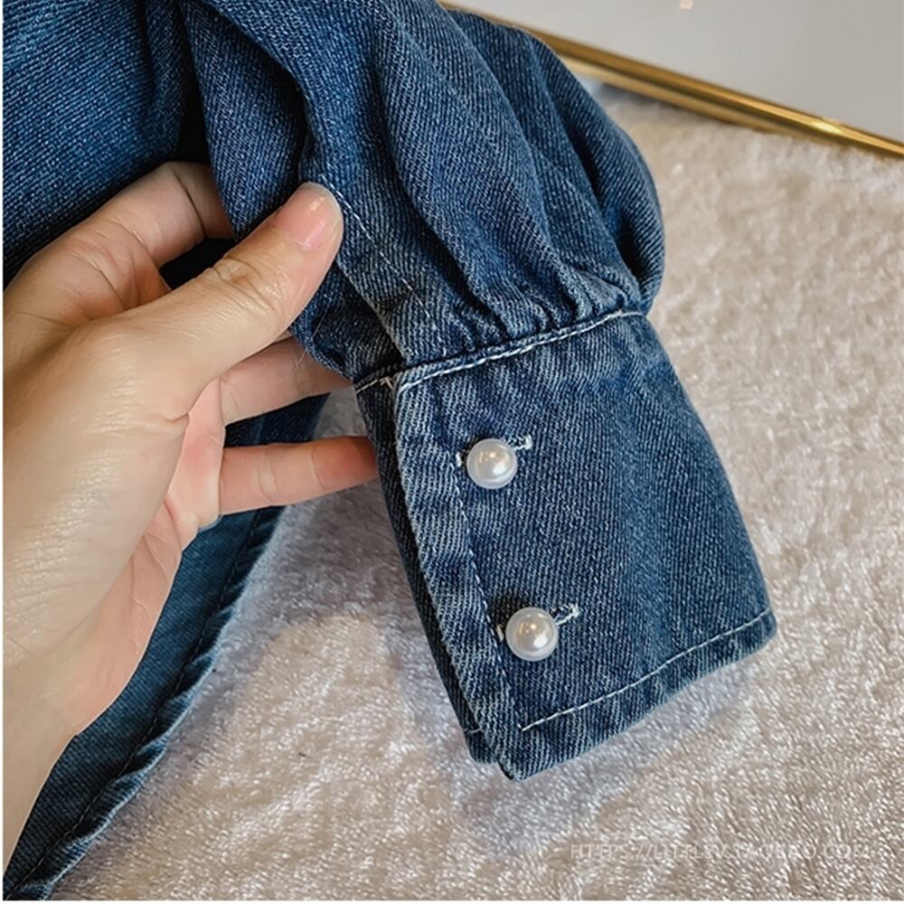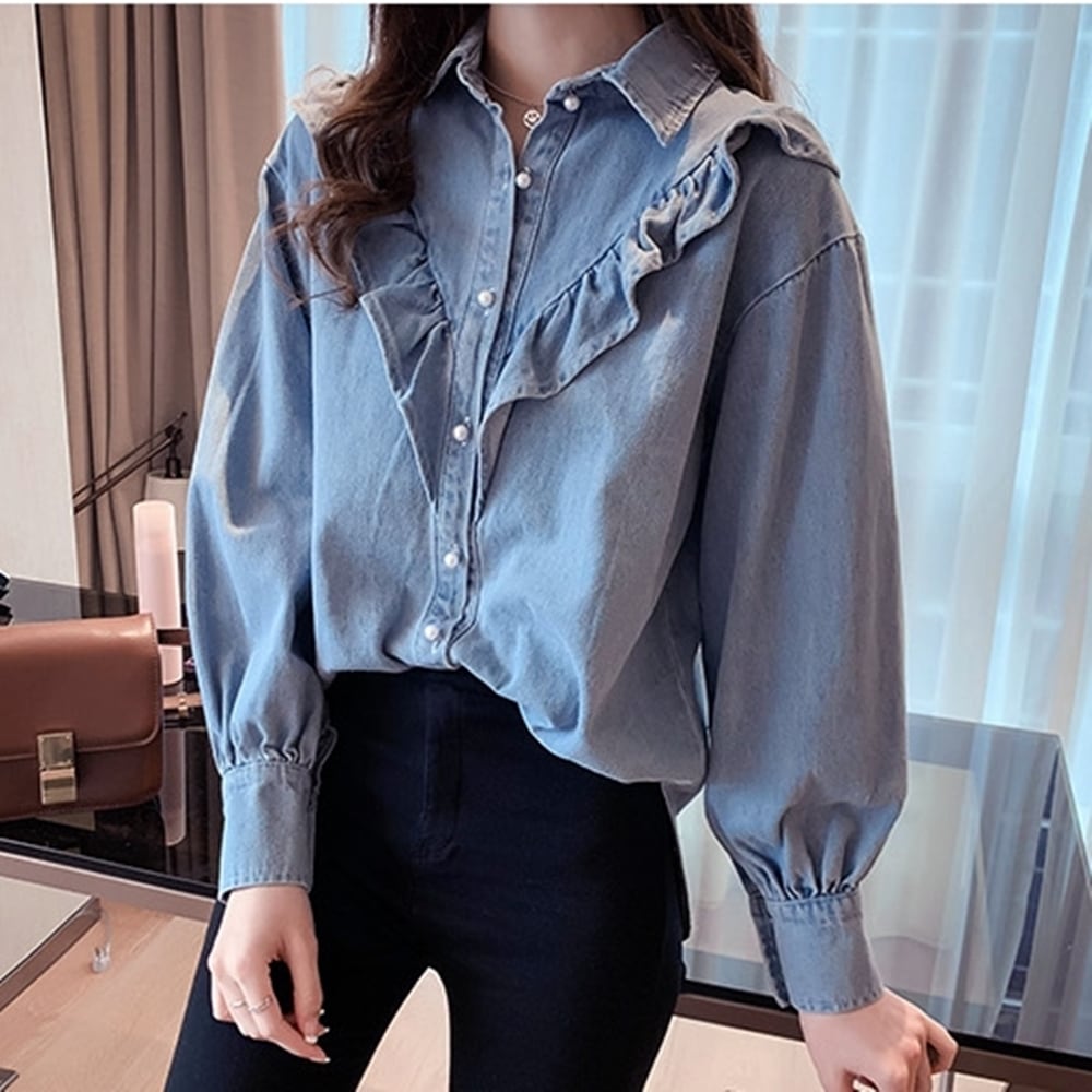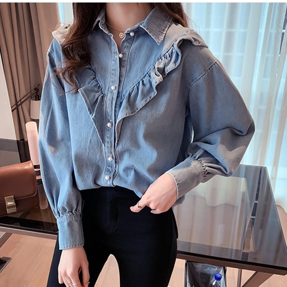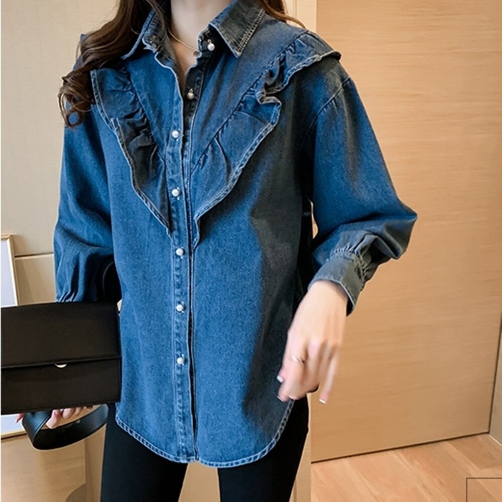 【M~4XL】大きいサイズ ゆったり フリル デニム ボタン シャツ