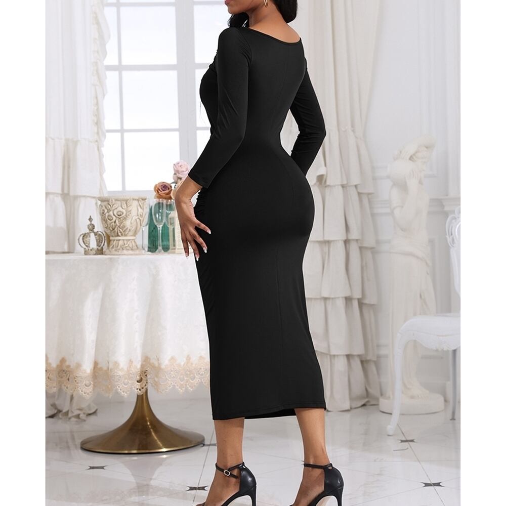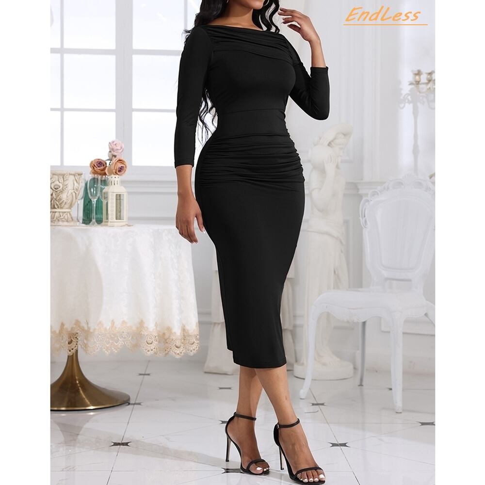 【S~XL】 長袖 プリーツ ワンステップスカート ドレス