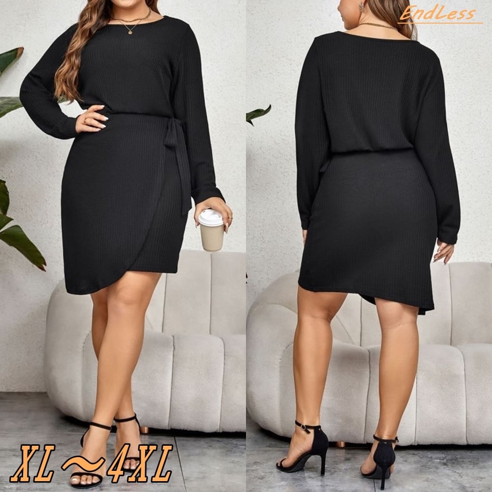【XL~4XL】 細見え プラスサイズ 長袖 ウエストタイ ドレス