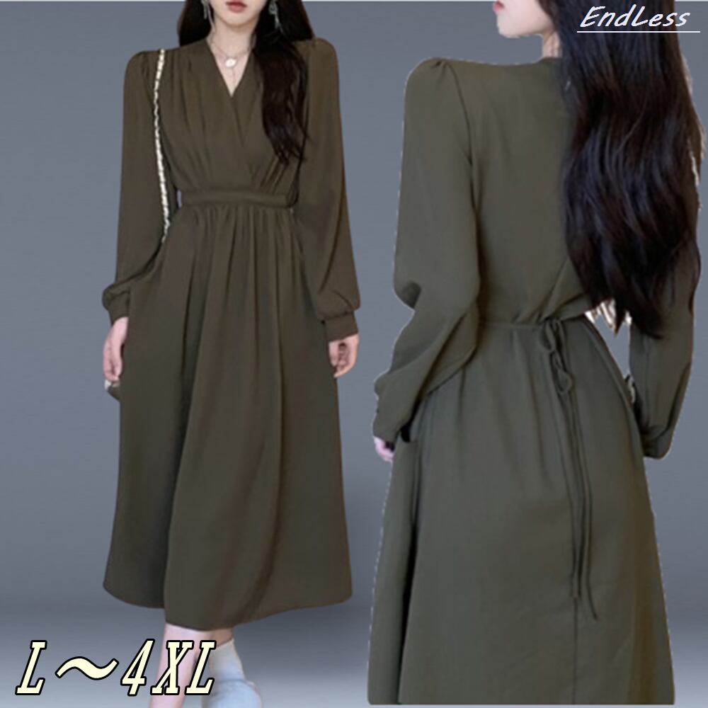 【L~4XL】 プラスサイズ Vネック 長袖 ロングスカートドレス