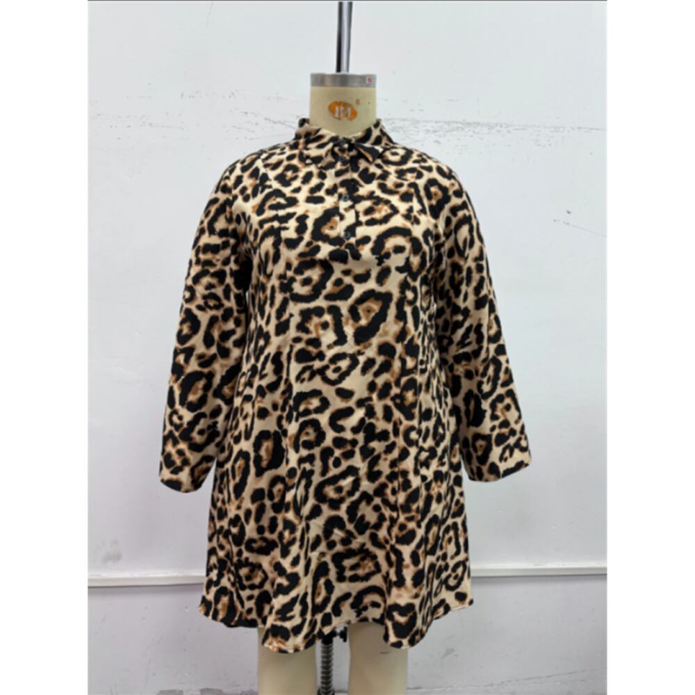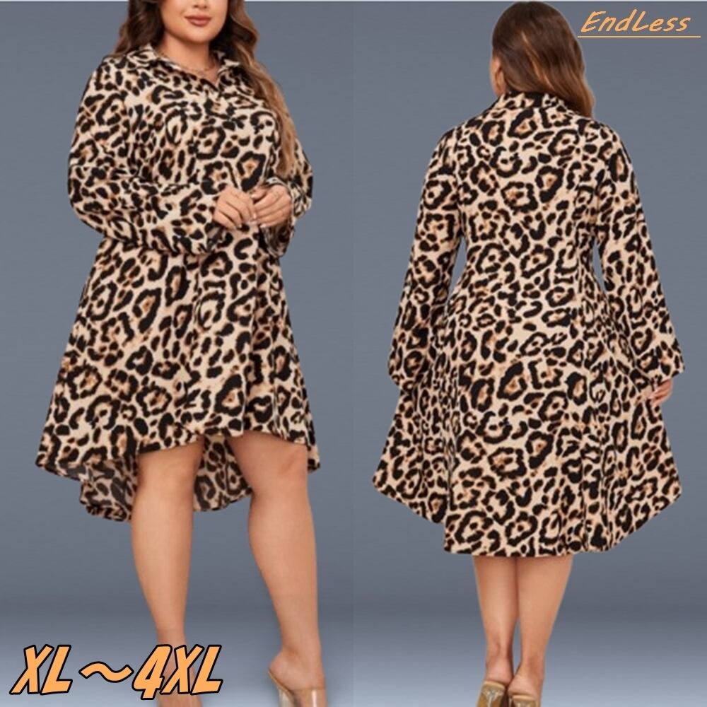 【 XL ~ 4XL 】 ヒョウ柄 プリント ドレス ワンピース シャツドレス