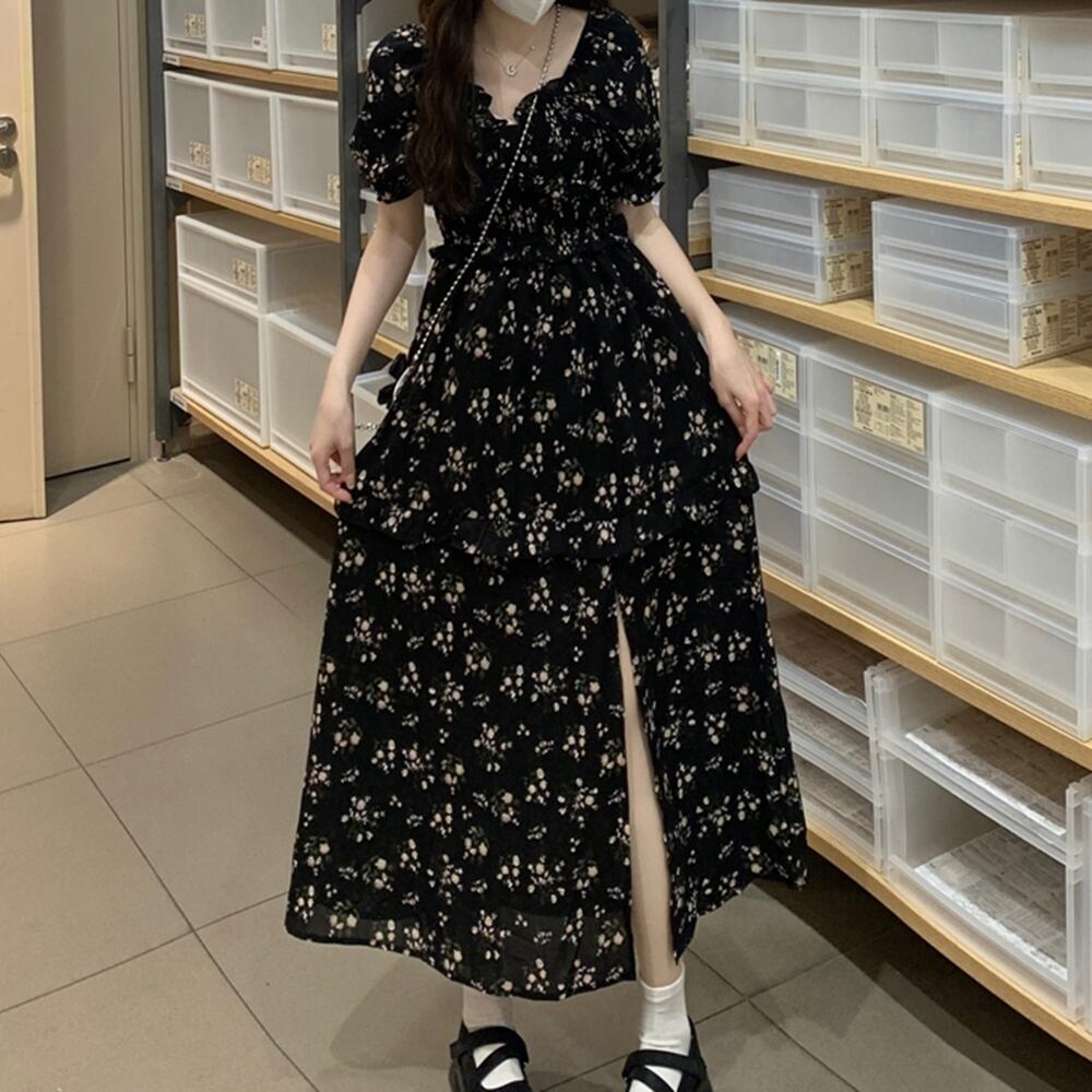 【M~4XL】 フレンチ 若見え 細見え スリットワンピース