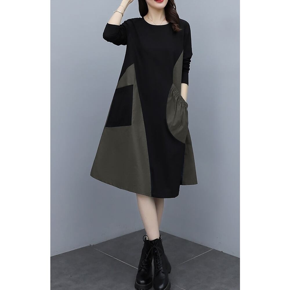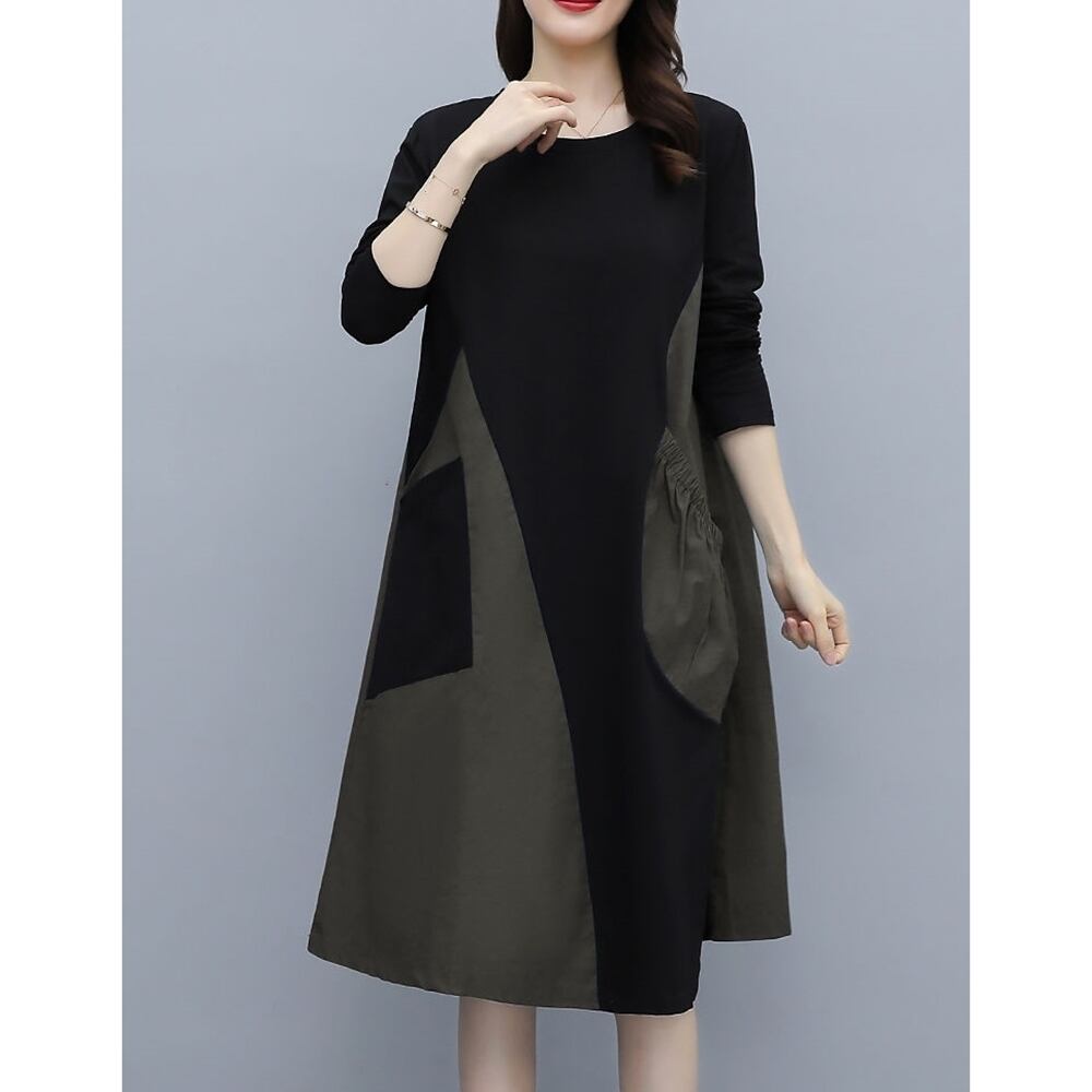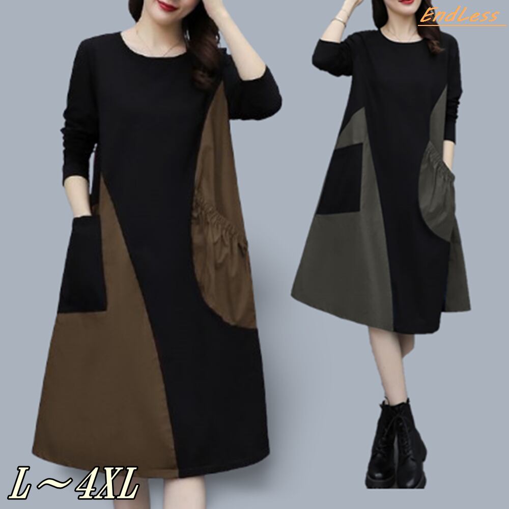 【L~4XL】 春 冬 長袖ゆったりウエスト ワンピース
